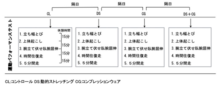 今回我々は、瞬発的な運動パフォーマンスの発揮に有効とされる DS と、生理的効果が高いとされる CG を併用することで、単独で実施する場合よりも運動パフォーマンスが向上するという仮説を設定した。この仮説を検証するために、以下の 4 つの条件――①ストレッチングなし・CG 装着なし(以下:CL条件)、②DS 実施のみ(以下:DS 条件)、③CG 装着のみ(以下:CG 条件)、④CG 装着後にDS を実施(以下:CG+DS 条件)――を比較検討し、どの条件が運動パフォーマンスの向上に最も影響を及ぼすかを明らかにすることを目的とした。