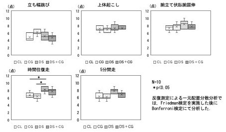 立ち幅跳びは、CG条件が6.2±0.7点、次いでDS条件が5.2±1.1点、CL条件が4.8±0.9点、CG+DS条件が4.7±0.9点であり、各条件において差は認めなかった。上体起こしに関しては、DS条件は7.3±0.9点、CG条件が6.8±0.7点、CL条件が6.8±0.7点、CG+DS条件が7.3±0.5点であり、各条件において差は認めなかった。次に腕立て伏臥腕屈伸に関しては、DSが8.3±1.1点、CG+DS条件が7.2±0.7点、CL条件が7.3±0.7点、CG条件が8.2±0.7点であり、各条件において差は認めなかった。時間往復走に関しては、CG条件(6.3±0.7点)と比較してDS条件(8.2±0.7点)において有意に高かった(P=0.032)。また、CL条件(6.7±0.7点)と比較してもDS条件において有意に高かった(P=0.021)。CG+DS条件は7.7±0.9点で各条件との差は認めなかった。最後に5分間走では、DS条件7.8±0.7点、CG条件6.2±0.7点、CL条件6.3±0.9、そしてCG+DS条件が6.8±0.7点であり、各条件において差は認めなかった。